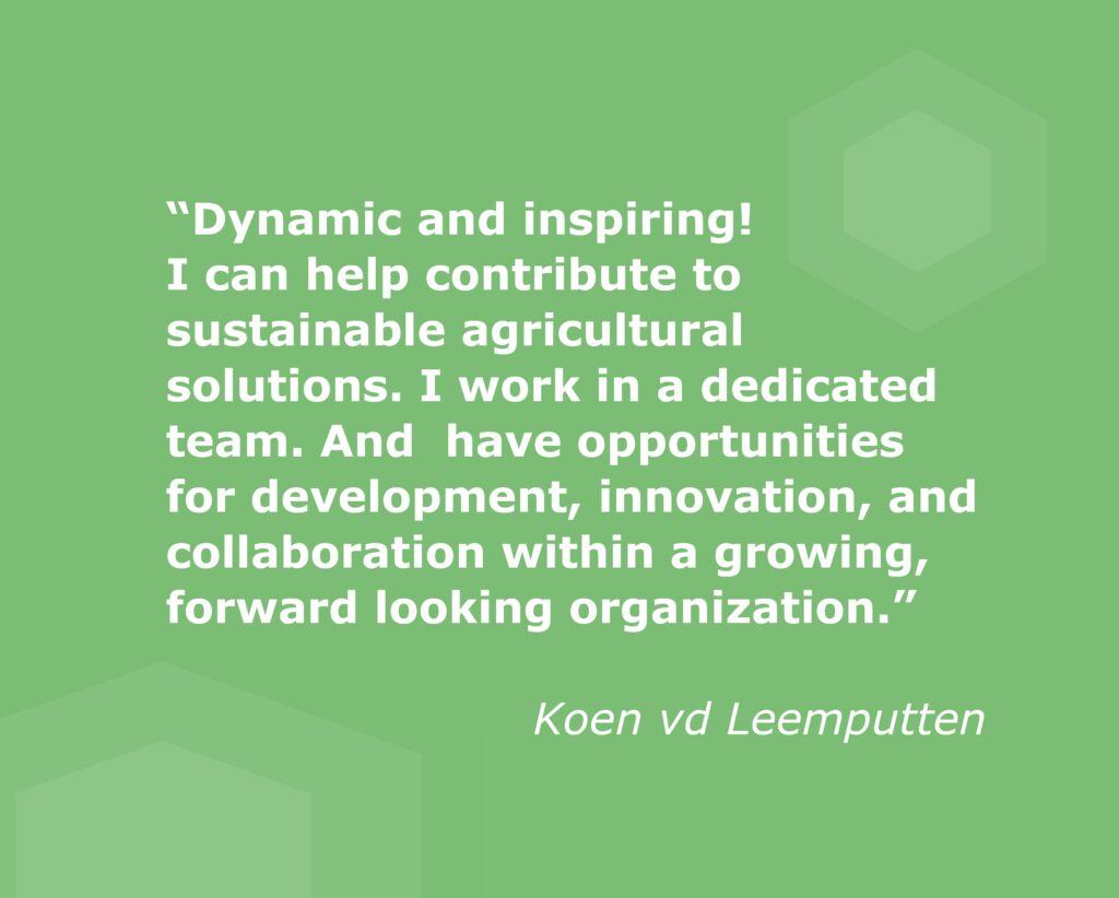 We asked him to complete the following sentence: Working at Genugten Agri is…. To which he replied: Dynamic and inspiring! I can contribute to sustainable solutions for agriculture. I work in a dedicated team. And I have opportunities for development, innovation, and collaboration within a growing, forward-looking organization.
