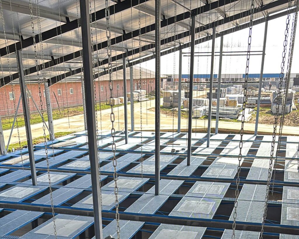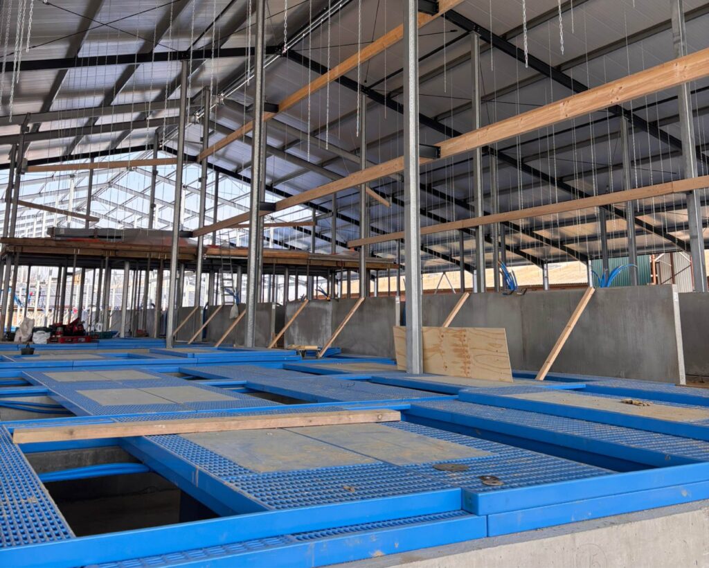 ✅ Central corridor: prefab walls and drainage channels are installed; concrete pouring is planned; which ensures a hygienic, easy-to-clean area for efficient barn management.